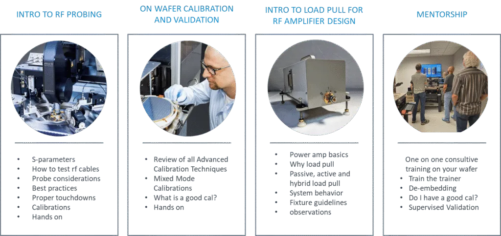 We offer small group, hands-on educational classes focused on teaching the advanced concepts needed for proficient RF probe station measurements. Theory and proper measurement techniques are reinforced with hands-on learning. We also offer mentorship and consulting days where customers bring their wafer, and our engineers work with them to properly characterize their wafer. Our instructors can tailor the instruction to specific topics such as what is a good calibration, fixturing, and de-embedding.